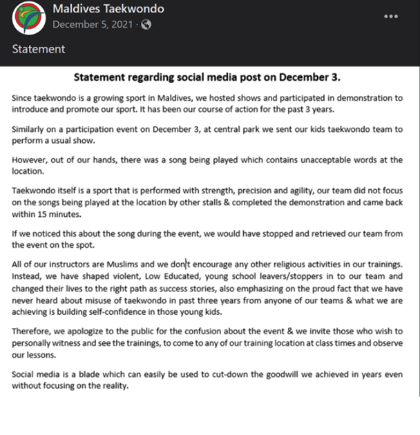 According to the Times of Addu, the Maldives media source which first reported the incident, Clique College says it had no desire to promote Christianity and no intention to play the Christian song, which they say auto-played from a playlist during a Taekwondo exhibition. The song’s lyrics reportedly included the words, “We believe in Jesus. We believe in Holy Spirit.” College officials say the song was changed as soon as the mistake was detected. The Taekwondo academy responsible for the exhibition similarly disclaimed responsibility on a Facebook post, saying that the music that was played was “out of their hands”.