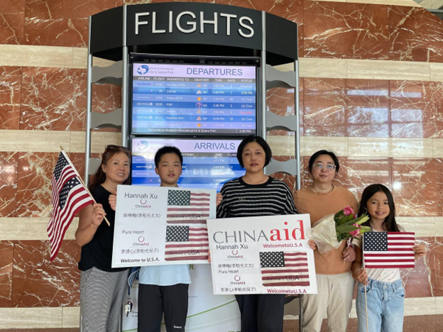Hanmei “Hannah” Xu (third from right) and Qingxin “Pure Heart” Li (second from left) holding signs as they are surrounded by volunteers from China Aid upon their arrival in the US.