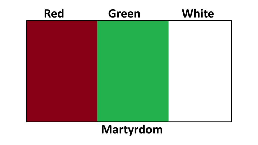 White and Green martyrdom is us daily living out the fact that we were given the gift of “being dead in Christ.” This is the same idea when Jesus said in Matthew 16:24, “If any man would come after me, let him deny himself and take up his cross daily and follow me.”