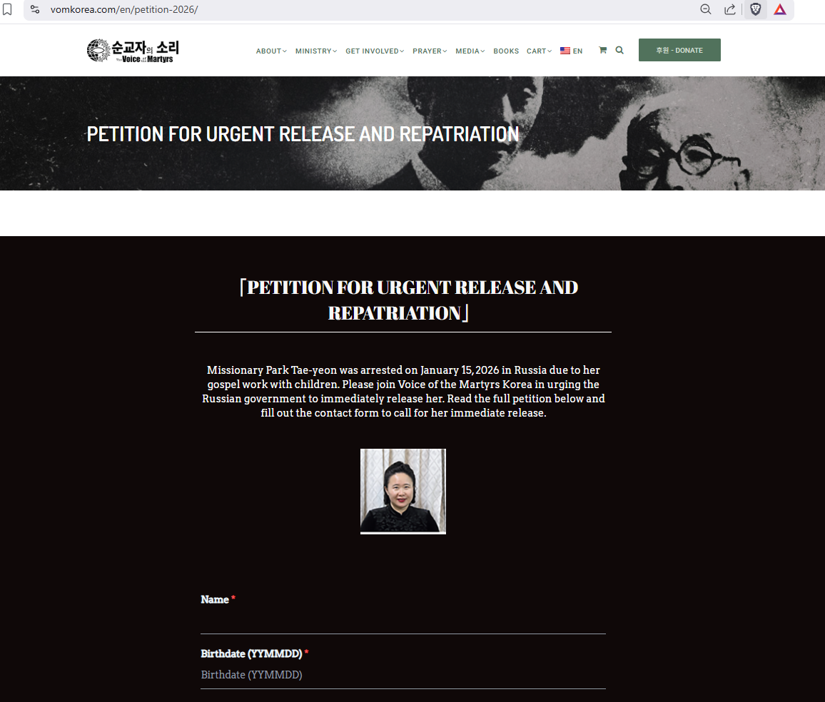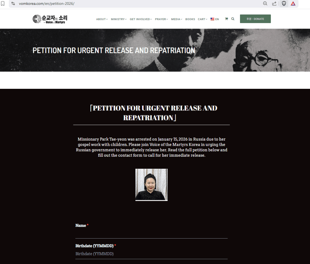 Individuals interested in signing the petition on behalf of Missionary Park can visit https://vomkorea.com/en/petition-2026.